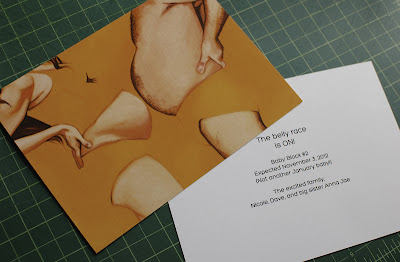 what you see above was the postcard-style announcement we sent out to family members. we did this with my first pregnancy too — it’s a nice way to tell people in a more personal manner that a new little person is coming, even if you can’t see them all to break the news. the illustration is actually from my new card line (i didn’t have time to make a new one for this occasion, and dave just loved the idea of him getting a big belly, which will never happen).